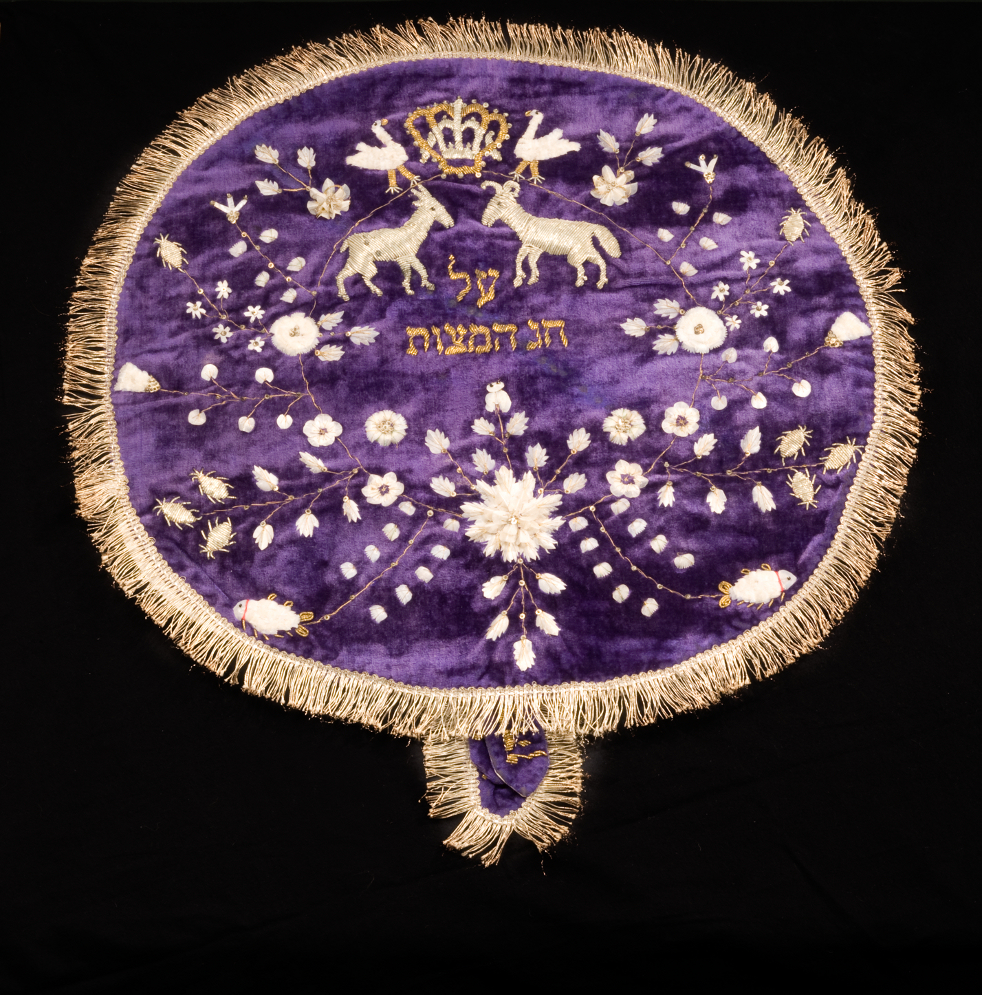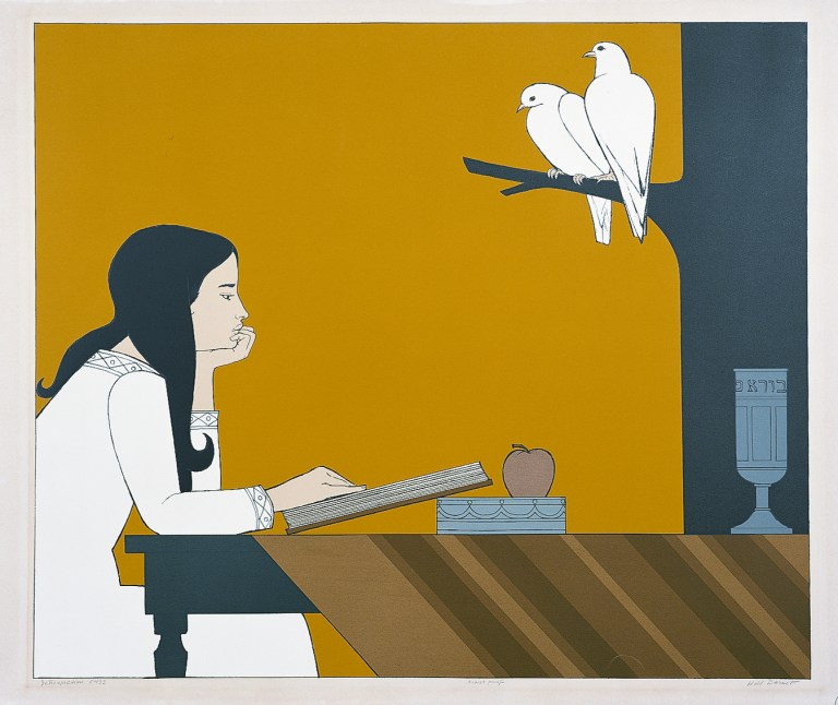 Among the earliest works in the exhibition is an etching by Felix Bracquemond (b. Paris, France, 1833–d. Sèvres, France, 1914), a contemporary of the Impressionists, titled Ébats de Canards (Ducks Frolicking) (ca. 1881). The Jewish ceremonial objects in the exhibition also date from the late nineteenth and early twentieth centuries, including a richly embroidered velvet matzah cover (ca. 1910) originating from a girls’ orphanage in Jerusalem; a beautifully illustrated marriage contract (1891) from Hamadan, in western Iran, featuring a peacock, a symbol of Persian royalty; a silver mezuzah probably from Eastern Europe (19th century); and a picture frame with a stately peacock design from the Bezalel School of Arts and Crafts in Jerusalem (ca. 1920).