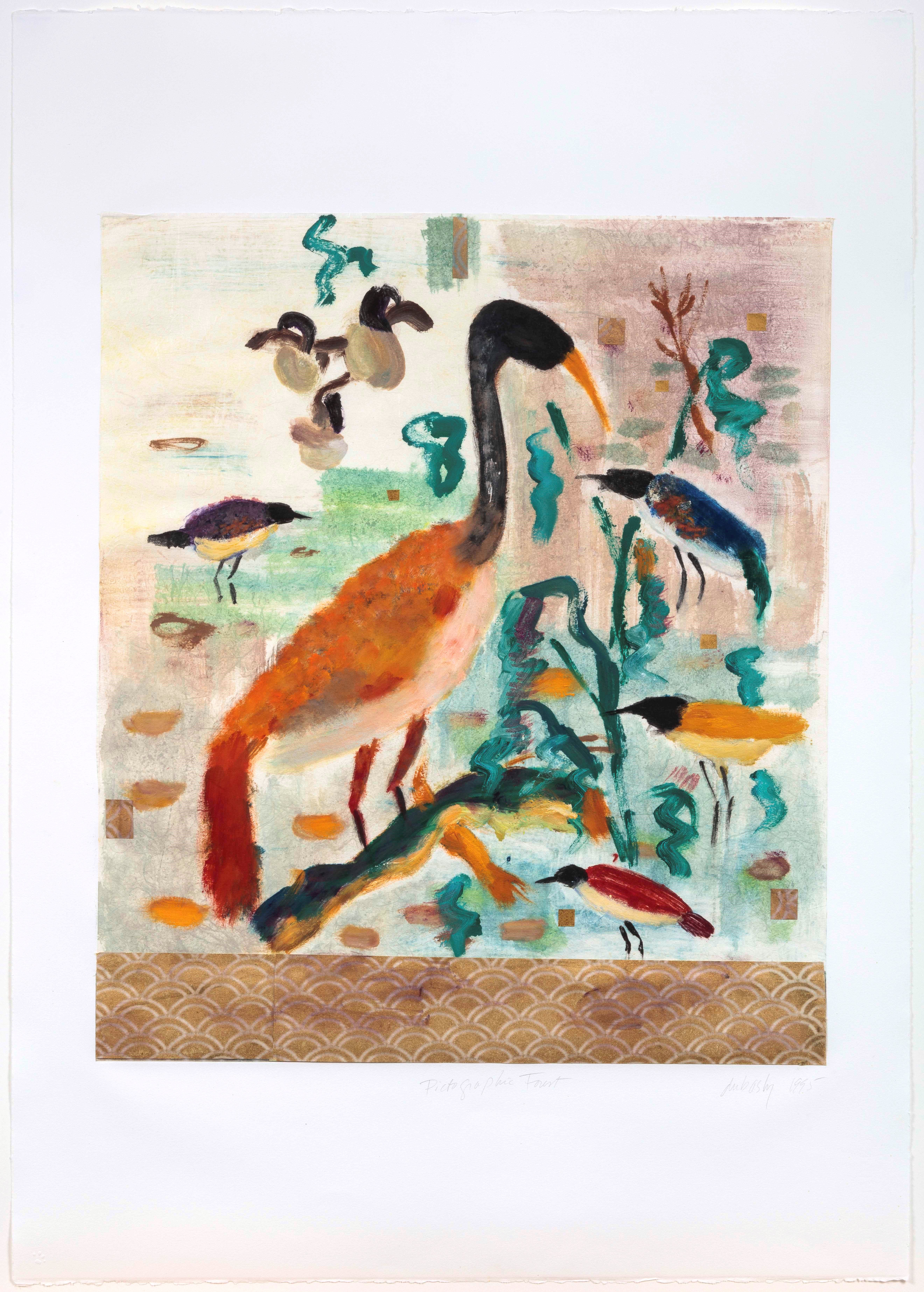 Several artists bring attention to environmental issues, including Dan Bruggeman (b. Omaha, Nebraska, 1957), in a mixed media work on paper, Science of Birds: The Magpie (1999), and Paul J. Greenfield (American, dates unknown), whose ornithological drawings appear in field guides to the birds of Ecuador, where he has lived since 1972. Surrealism, fantasy and folk traditions inform the real and imagined birds in works by several artists. These include: Garden of Eden, from Drawings for the Bible (1960), by Marc Chagall (b. Liozno, Russian Empire, 1887–d. Saint-Paul-de-Vence, France, 1985); a lithograph from the series Gates of the Immigrants (1970) by Naftali Bezem (b. Essen, Germany, 1924–d. Tel Aviv, Israel, 2018); A Sea Change (1963) by Lars Bo (b. Kolding, Denmark, 1924–d. Paris, France, 1999); and Feigele Sing Mir A Liedele (Little Bird, Sing Me a Song), from the portfolio Yiddish Folksongs (1962), by artist Anatoli Kaplan (b. Rogachev, Russian Empire, 1902–d. Leningrad, Russian SFSR, 1980).