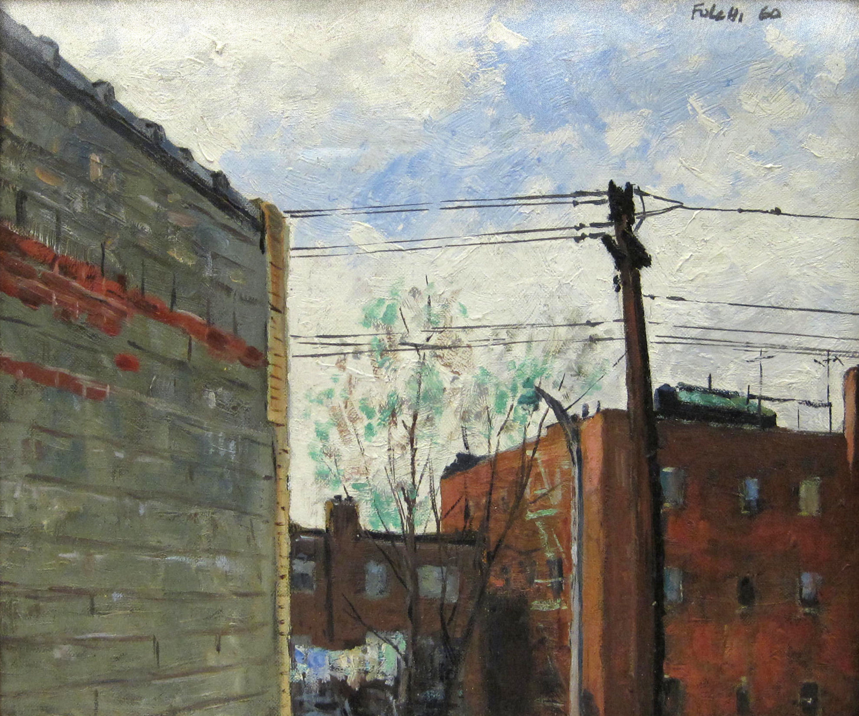 William P. Folchi (American, 1922–1992), Untitled (View from Yard Facing Williamsbridge Road), 1960. Oil on board, 14 x 12 in. Courtesy of the Folchi Family.