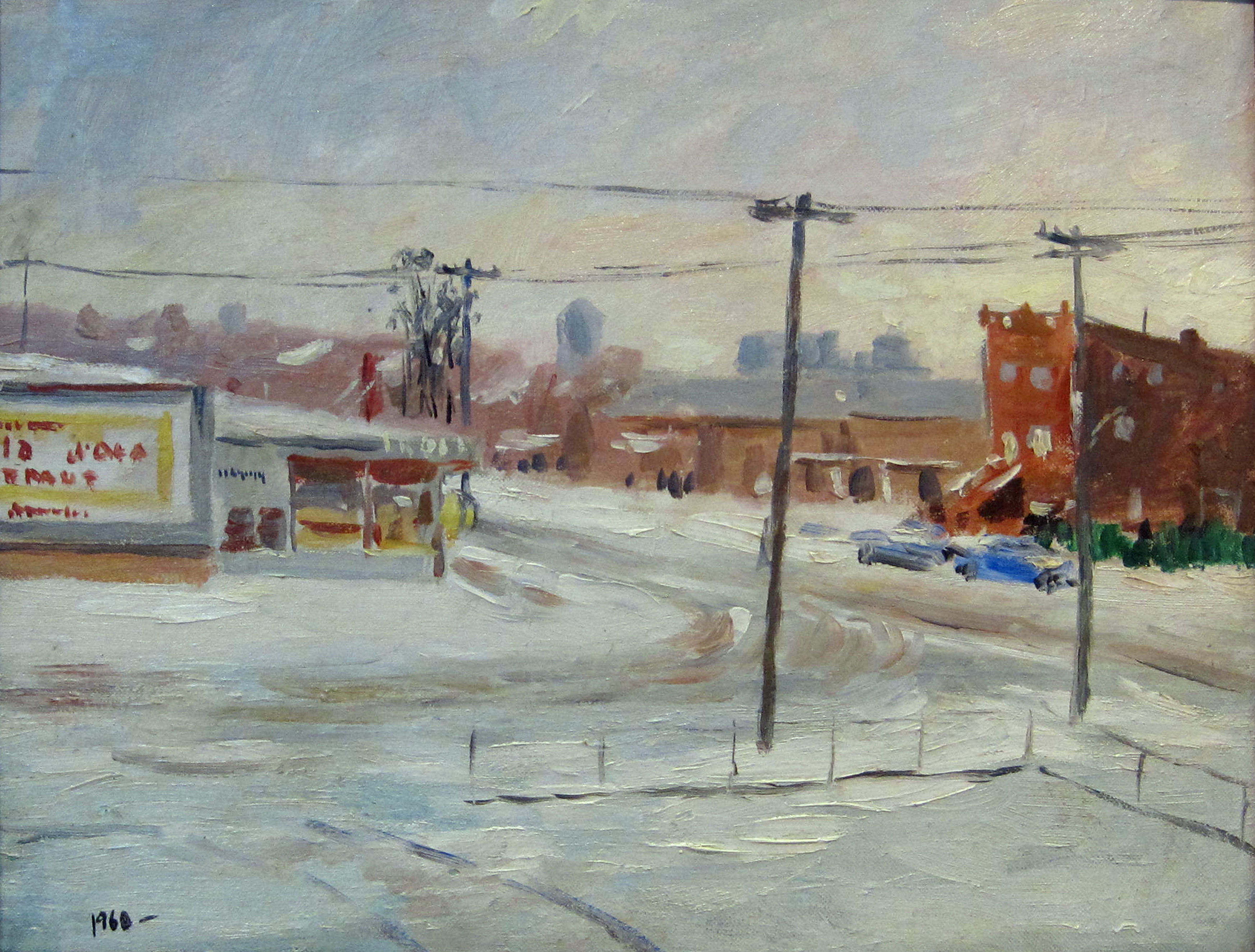 William P. Folchi’s paintings in this exhibition depict the Bronx from 1956–1960 mostly around the neighborhoods of his Morris Park home and Pelham Parkway automotive business. Although Folchi studied at the Art Students’ League in New York, he never publicly exhibited during his lifetime. In 2012, however, another son, William O. Folchi, rediscovered dozens of paintings in the basement of the family home, bringing to light the full breadth of his work. The paintings capture a bygone era—bucolic views of Williamsbridge Road before it was commercially developed, a vacant lot at the corner of Lydig Avenue now occupied by a gas station, and green backyards strung with clotheslines. Many of the works are painted from the elevated perspective of a window in the family’s Yates Avenue home, giving the impression that the viewer is catching a glimpse of something fleeting.