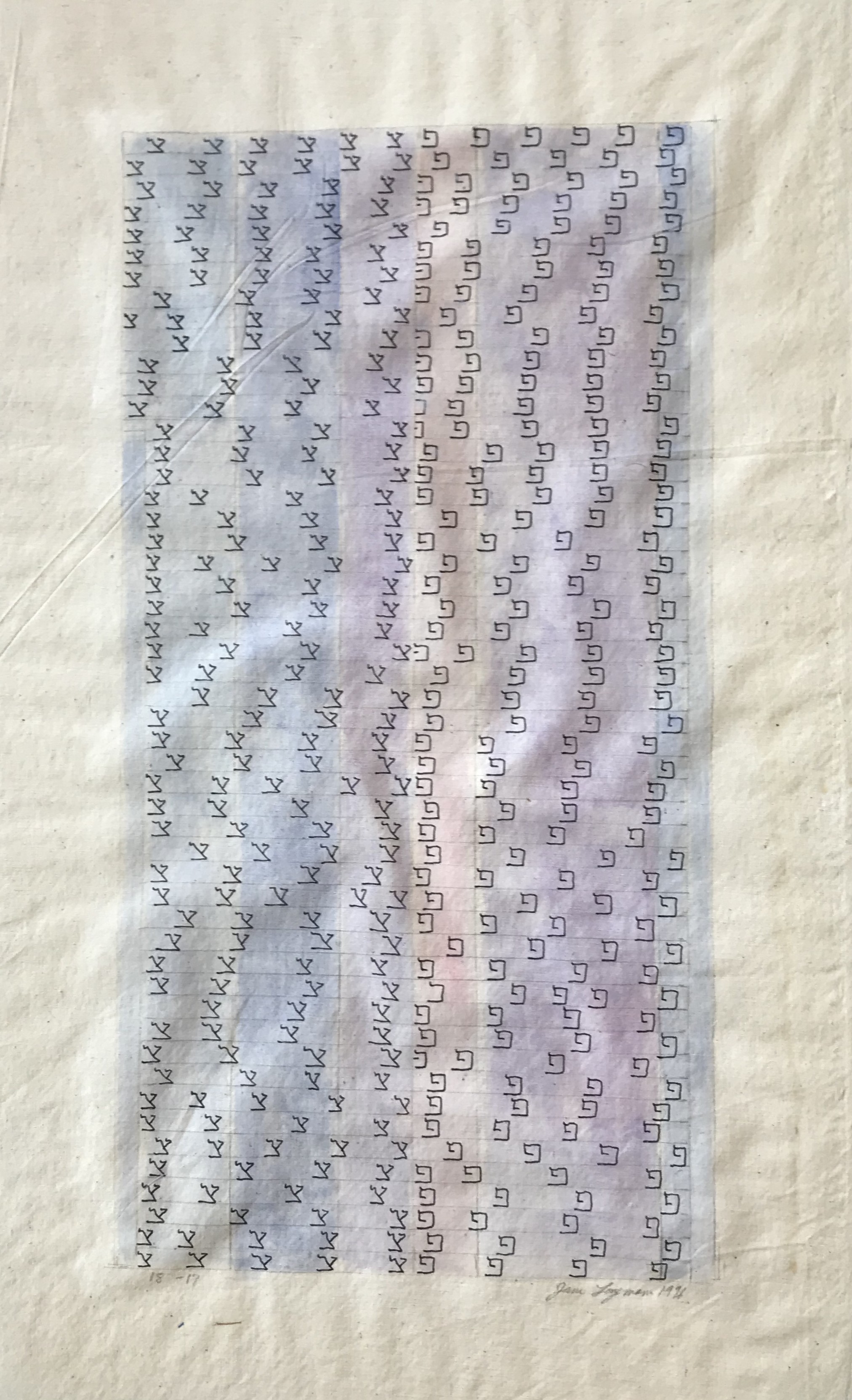 Abstract works by Peter Freudenthal (b. 1938), Robert Kirschbaum (b. 1949), and Susan Schwalb (b. 1944) evoke Jewish mysticism, including references to Kabbalah and Jewish legends. Four other artists, A. Raymond Katz (1895–1974), Jane Logemann (b. 1942), Chava Wolpert Richard (1933–2015), and Rina Rotholz (1928–2020), use Hebrew letters that draw attention to both the abstract and spiritual qualities of language.