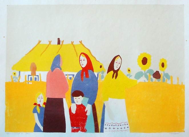The subjects of the artists in the Leningrad Workshop ranged widely. Boris Ermolaev (Russian, 1903-1982), for example, was a successful painter who drew heavily on the traditions of folk art and icon painting. One of his lithographs, Mothers (1961), rendered in vibrant colors and emphasizing flattened, linear shapes, most strongly exemplifies the conventions of Socialist Realism in its idealized depiction of workers on collective farms. Other works in the show, however, focus on more foreboding subjects, such as a series by Gregory Israelevich (Russian, 1924-1999) depicting owls that symbolize the passing of time and mortality.