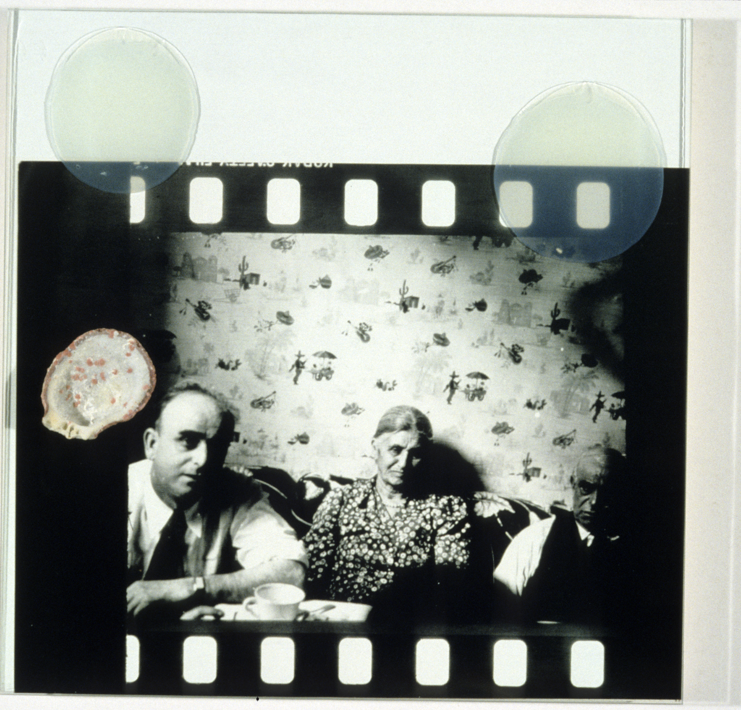 The exhibition includes selections from three series, “Ancestral Traces” (2002-2004), “Exiles and Nomads” (1997-2006) and “Ants and Luminous Insects” (2004). These works include transparent photograph collages and gouache paintings on wood or plate-glass, some appended with paper flowers or tulle, and gouache drawings on Japanese paper featuring spiraling “dots,” or “celestial bodies,” suggesting biological cells that refer to a blood disorder from which the artist has suffered. Many of Amato’s works utilize handwritten text, montage, collage and multiple viewpoints to suggest the complexity of her background as a daughter of a Ladino-speaking Sephardi New York émigré family, who originated in Spain and lived in Rhodes and Turkey, and ultimately emigrated to the Bronx.