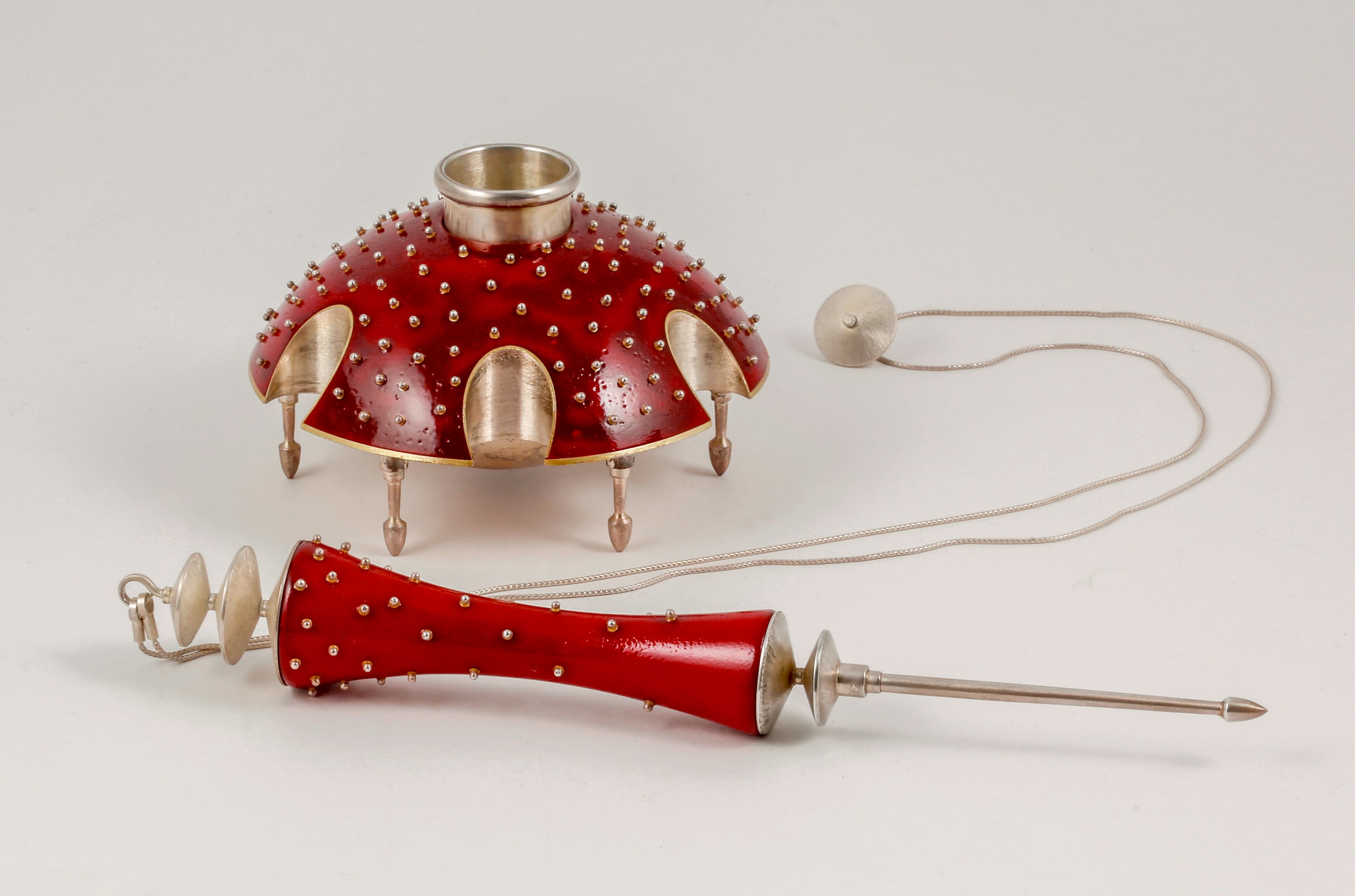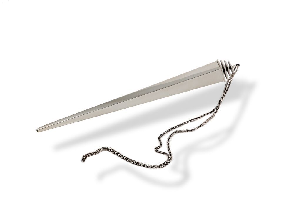Contemporary yads can be particularly inventive. The ones on view range from the art deco-inspired gold-plated Metropolis Torah pointer by French designer Richard Lauret to a unique multi-layered and boldly-colored red resin, copper, and silver pointer and stand by Jennifer Banks, who studied jewelry and metal arts at California College of Arts and Crafts, as well as examples by twentieth-century masters Ludwig Wolpert and Bernard Bernstein.