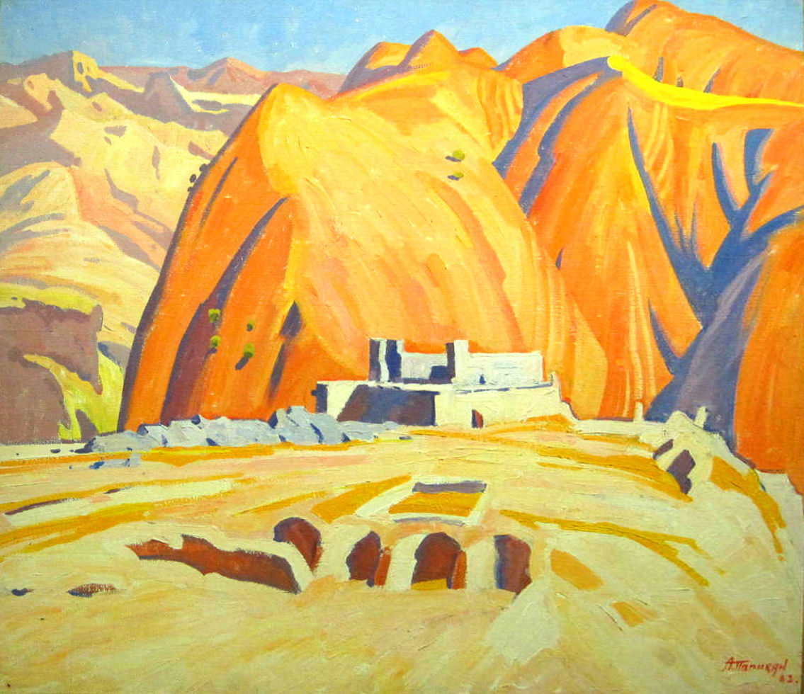 From at least the 1920s, when many artists drew inspiration both from national styles, such as folk art, and from modernist sources, painting in Soviet Armenia was typically characterized by simplified schematic forms painted in vivid, saturated colors. Works included in this exhibition by Albert Papikian, Aram Kupetsian and Peter Shlikov depict familiar geographic landmarks that carry strong nationalistic overtones, demonstrating the persistence of this approach into the 1960s.