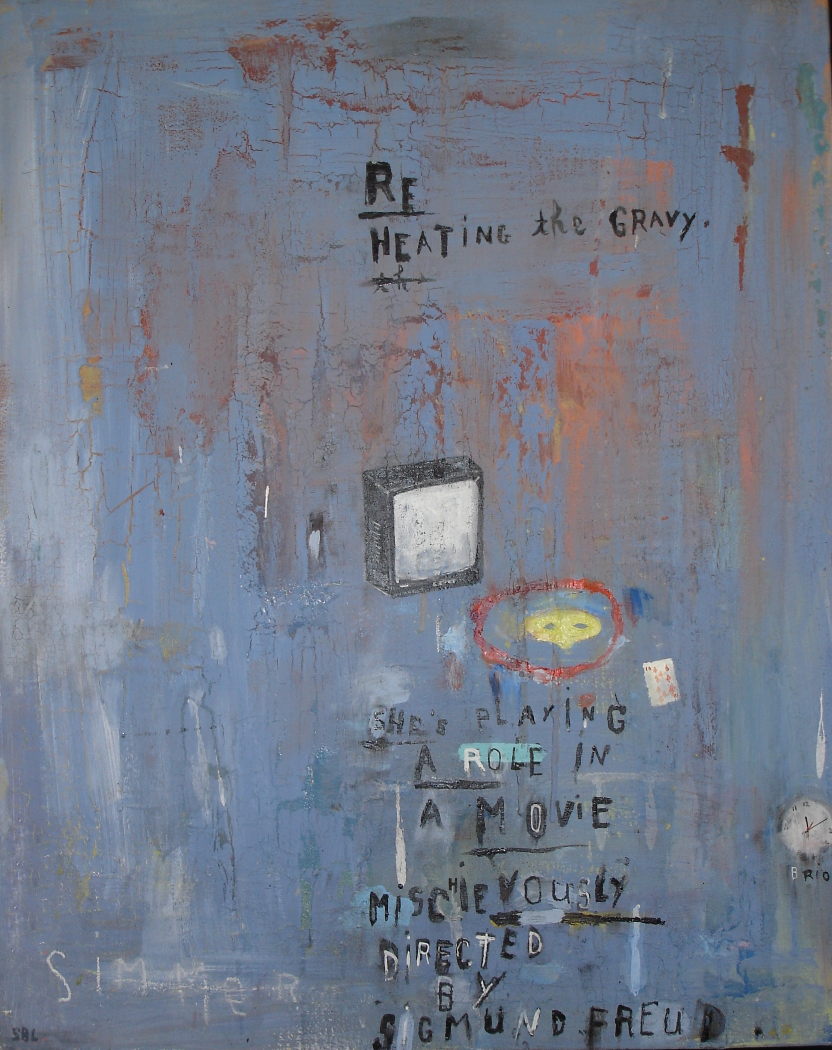 The exhibit includes paintings, prints, and collage. The use of text in all of the works draws from a variety of cultural forms: sources include signs, comics and cartoons, diary entries, and political banners. Text is simultaneously and alternately informational and visual, rhetorical and symbolic. The use of text sometimes challenges the viewer to consider the place of the image, in turn, as a source of information.